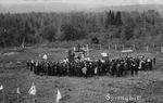 Description :A L'AVANT DE L'EGLISE STE-AGNES DE LAC MEGANTIC, UN FRERE EN ROBE DE BURE S'ADRESSE A UNE FOULE DU HAUT D'UNE CHAIRE