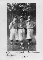 Description :TROIS JEUNES HOMMES POSENT A L'EXTERIEUR L'ETE DANS UN UNIFORME AU INITIALE DU COLLEGE DU SACRE-COEUR. IL S'AGIT DE LEON BECIGNEUL, EM. LAPORTE ET EM. BUREAU