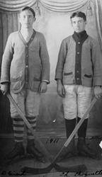 Description :DANS UN STUDIO, DEUX GARCONS; A. GIRARD ET CH. CHOQUETTE D'ENVIRON 17 ANS POSENT EN TENU DE HOCKEY