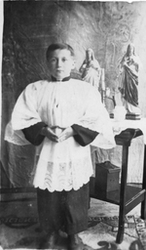 Description :DANS UN STUDIO UN JEUNE GARCON D'ENVIRON 12 ANS POSE DANS SON HABIT D'ENFANT DE CHOEUR