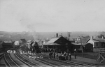 Description :UN TRAIN EST A LA GARE, TANDIS QUE DES HOMMES SE TIENNENT AVEC DES PELLES, PRES D'UN CHARIOT SUR RAILS REMPLI DE CHARBON. D'AUTRES POSENT PRES DE LA GARE DU CANADIAN PACIFIQUE RAILWAY