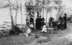 Description :UN GROUPE DE FRERES DU SACRE-COEUR DE LAC MEGANTIC SUR LES RIVES D'UN LAC. QUELQUES HOMMES ET ENFANTS LES ACCOMPAGNENT