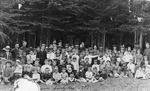Description :VUE SUR UN GROUPE D'ETUDIANTS QUI POSENT EN COMPAGNIES DE QUELQUES FRERES DU SACRE-COEUR ET ADULTES LORS D'UN PIQUE-NIQUE A SANDY BAY AU LAC MEGANTIC