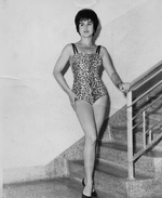 Description :VUE DE CARMEN BELL DEBOUT AU PIED D'UN ESCALIER. ELLE PORTE UN MAILLOT DE BAIN A BRETELLES DOUBLES EN TISSU IMMITATION OCELOT.