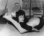 Description :VUE DE MONIQUE L.-BELL COUCHEE SUR LE DOS, SUR UN TAPIS, LES JAMBES REPLIEES ET PASSEES SOUS LES BRAS, LE GAUCHE TENANT LES PIEDS JOINTS PLUS LOIN QUE LA TETE, LE DROIT ALLONGE JUSQU'A LA HANCHE DROITE