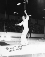 Description :VUE DU FUNAMBULE EN CERCEAU ALBERT BELL S'EXECUTANT DANS UN ARENA, AU-DESSUS DE LA PATINOIRE (ON VOIT LES BANDES). A L'ARRIERE-PLAN, DANS LES GRADINS, DES SPECTATEURS