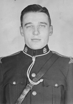 Description :VUE D'ALBERT BELL JEUNE HOMME EN UNIFORME D'APPARAT (EPAULETTES DECORATIVES, CORDON BLANC, BANDOULIERE) DE LA POLICE MONTEE DE RESERVE, LES FRONTIERSMEN
