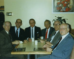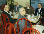 Description :VUE D'ALBERT BELL ATTABLE AU RESTAURANT AVEC CINQ AMIS (DONT L'UN EST PARTIELLEMENT CACHE), TROIS D'UN COTE, TROIS DE L'AUTRE. ALBERT BELL EST ASSIS A L'EXTREME DROITE FACE A LA CAMERA