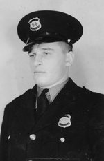 Description :VUE A PARTIR DES EPAULES, DU "CONSTABLE" ALBERT BELL, INSIGNE 54, DE LA SURETE MUNICIPALE DE SHERBROOKE, EN UNE FORME ET PORTANT SA CASQUETTE DE POLICIER