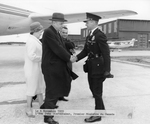 Description :VUE DE JOHN DIEFENBAKER ET SON EPOUSE EDNA MAC BROWER. IL SERRE LA MAIN DU CHEF DE POLICE DE MONT-JOLI, ALBERT BELL, A L'AEROPORT DE CETTE VILLE. UN TROISIEME HOMME, NON-IDENTIFIE OBSERVE LA SCENE
