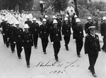 Sujet principal :POLICIERS PARADANT SUIVI D'UNE FANFARE LORS DE LA ST-JEAN-BAPTISTE A SHERBROOKE