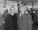 Description :VUE DE M. ALBERT BELL ET DE DANIELLE OUIMET PHOTOGRAPHIES COTE-A-COTE DANS LE HALL DE L'AEROGARE. L'ARTISTE POPULAIRE, NIECE DE ALBERT BELL A LA MAIN GAUCHE SUR L'EPAULE GAUCHE DE SON ONCLE QUI PORTE SON BLOUSON ET SA CASQUETTE DE POLICIER