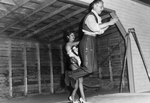 Description :VUE D'ALBERT BELL ET DE MONIQUE LAVOIE S'EXERCANT DANS UN ABRI OUVERT. IL EST A GENOUX SUR UN FIL DE FER, CONTROLANT SON EQUILIBRE DE SES BRAS AVANCES. IL PORTE UN BLERO SUR UNE CHEMISE BLANCHE ET DES PANTALON LISERER SUR LE COTE DE BANDES DEC...