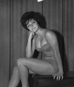 Description :VUE DE KATLEEN BELL PHOTOGRAPHIEE A L'INTERIEUR, EN BIKINI, LE POING DROIT APPUYE SUR LA JOUE DROITE. ELLE EST ASSISE SUR UNE PETITE TABLE SUR LE BORD DE LAQUELLE EST DEPOSEE SA MAIN GAUCHE. A L'ARRIERE-PLAN, DES RIDEAUX TENDUS