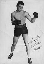 Description :VUE EN PIED D'ALBERT BELL EN MAILLOTS ET CHAUSSSURES DE BOXEUR ET PORTANT DES GANTS DE BOXE.