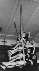 Sujet principal :MME BELL (HERMANCE BRUNEAU) ET SES TROIS ENFANTS, KATYLEEN, BENNY ET CARMEN, EN TENUE DE CIRQUE, SUR UNE ECHELLE SUSPENDUE