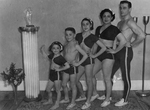 Description :VUE DE LA FAMILLE REGARDANT UN PEU DE BIAIS LA CAMERA, ALIGNEE DE PROFIL, DE GAUCHE A DROITE; LA CADETTE KATLEEN, BENNY, CARMEN, LA MERE ET LE PERE. ILS SONT TOUS EN TENUE DE CIRQUE A ASBESTOS