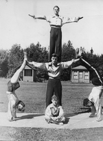 Description :VUE DE FACE DE 5 EQUILIBRISTES. LE PLUS PETIT EST ASSIS AU REPOS (YVAN BRUNEAU) AUX PIEDS DU PLUS GRAND (ALBERT BELL) QUI TIENT SUR SES EPAULES UN COMPAGNON DEBOUT AUX BRAS TENDUS (G.PERRAULT) TANDIS QU'A CHAQUE MAIN IL RETIENT AUX CHEVILLES A...