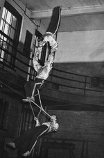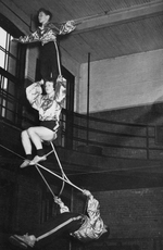 Description :VUE D'UNE SEQUENCE DE TRAVAIL D'UN TRIO D'EQUILIBRISTES; ALBERT BELL MAINTIENT, PERPENDICULAIRE AU FIL DE FER SOUS LEQUEL IL EST A L'HORIZONTALE, L'APPAREIL QUI MONTENT UNE JEUNE FEMME (ASSISE) ET UN GARCONNET DEBOUT SUR SES EPAULES (YVAN BRUN...