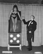 Description :VUE D'ALBERT BELL DE COTE, EN TOXEDO, PANTALONS, CEINTURON NOIR, ET EN CHEMISE BLANCHE PRESENTANT DE LA MAIN DROITE LEVEE UNE ASSISTANTE EN BIKINI NOIR QUI SEMBLE SORTIR D'UN GROS CUBE DONT 2 FACES SONT OUVERTES. LE TOUT SUR FOND DE RIDEAUX DE...
