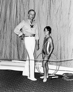Description :VUE D'ALBERT BELL EN PANTALON BLANC ORNE SUR LE COTE D'UNE BANDE DE COULEUR ET EN BLOUSE PALE A PAPILLON DECORATIF A L'AVANT, DEBOUT, FAISANT FACE AU 3/4 A JUDITH LEVESQUE, FILLETTE EN MAILLOT. DEVANT EUX, UN FIL DE FER; DERRIERE EUX, DEUX CER...