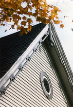 Description :14.1 : VUE SUR UN PIGNON PERCE D'UN OEIL-DE-BOEUF ET A LA CORNICHE DECOREE DE MOTIFS DE BOIS DECOUPE. - 14.3 ET 14.4 : VUE DE PRES DE L'OEIL-DE-BOEUF DETAILLANT LES DEFAUTS A SON CADRAGE.