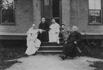 Description :QUATRE RELIGIEUX ET UN LAIC ASSIS SUR LES MARCHE D'UN PERRON