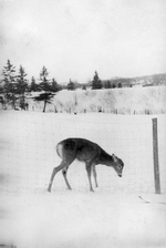 Description :UN PETIT CHEVREUIL DANS LA NATURE L'HIVER. EN AVANT DE LUI UNE CLOTURE EN BROCHE. AU LOIN, DES ARBRES.