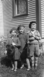 Description :FRANCOISE, IRENE ET JEAN DESILETS A LEUR PREMIER JOUR D'ECOLE. ILS PORTENT UN BERET. LES FILLES ONT UN SAC D'ECOLE A LA MAIN TANDIS QUE JEAN PORTE LE SIEN SUR SON DOS.