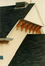 Description :VUE DE BIAIS D'ANGLES ORNEMENTAUX SUPPORTANT LE TRIANGLE SUPERIEUR EXCEDANT DU COMBLE DU BATIMENT D'UNE PORTION DE LA CORNICHE DECOREE ET DU RAPPORT ENTRE LES DEUX PIGNONS
