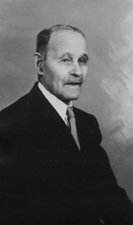 Description :VUE DE ULRIC BEAUDET AGE A PARTIR DE LA TAILLE ET LEGEREMENT DE COTE, PORTANT UN COMPLET SOMBRE, CHEMISE BLANCHE ET CRAVATE.