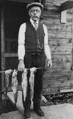 Description :VUE DE THEODORE OLIVIER A BIDDEFORD MAINE, DEBOUT SUR LE SEUIL D'UN BATIMENT DE BOIS, UNE TIGE DE BOIS PORTANT 4 POISSONS A LA MAIN