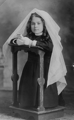 Description :VUE D'ALMA OLIVIER EN PREMIERE COMMUNIANTE AGENOUILLEE, CHAPELET ET LIVRE DE PRIERES EN MAIN. ELLE PORTE UN LONG VOILE BLANC