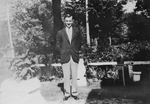 Description :PHOTO D'EXTERIEUR DE GERARD ARCHAMBAULT M.D. AGE D'ENVIRON 30 ANS DEBOUT, SUR UN FOND D'ARBUSTES ET D'ARBRES A L'ETE