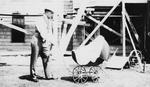 Description :VUE DE ARTHUR OLIVIER POUSSANT UN LANDAU DEVANT UN BATIMENT AVEC ECHAFAUDAGES
