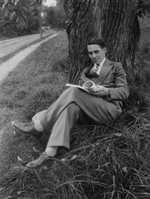 Description :VUE D'UN JEUNE HOMME ASSIS DANS L'HERBE AUX PIEDS D'UN ARBRE TENANT UN LIVRE DANS SES MAINS PEUT-ETRE POPULAR MECHANICS; IL SOURIT AU PHOTOGRAPHE.