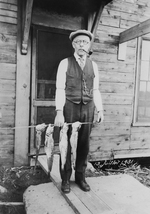 Description :VUE DE THEODORE OLIVIER A BIDDEFORD MAINE, DEBOUT SUR LE SEUIL D'UN BATIMENT (CHALET) DE BOIS, UNE TIGE DE BOIS PORTANT 4 POISSONS A LA MAIN