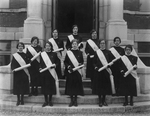 Description :VUE D'UN GROUPE D'ETUDIANTES (10) PORTANT UNE LARGE BANDOULIERE BLANCHE ET UN PARCHEMIN DE CIRCONSTANCES, PHOTOGRAPHIEES DANS LES MARCHES DE L'ENTREE PRINCIPALE DU MONT NOTRE-DAME ALMA OLIVIER, SOEUR D'ARTHUR OLIVIER EST LA PREMIERE A DROITE S...