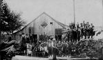 Sujet principal :RASSEMBLEMENT D'HOMMES (OUVRIERS, CLIENTS) DEVANT UNE SCIERIE