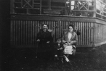 Description :VUE DE MME OLIVIER ET ALDES MORIN ASSISE COTES-A-COTES DANS UNE CHAISE BERCANTE. ENTRE ELLES MAIS UN PEU EN AVANT, UN PETIT GARCON SUR CE QUI SEMBLE ETRE UN VIEUX TRICYCLE