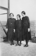 Description :DES ETUDIANTES DU MONT-NOTRE-DAME POSENT SUR LE TOIT DE L'EDIFICE AU PRINTEMPS. ELLES PORTENT LEUR UNIFORME 5.1; ALMA OLIVIER EST PEUT-ETRE CELLE DU CENTRE