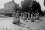 Description :PROCESSION NON IDENTIFIEE, ON APERCOIT DES JEUNES FILLES VETUES DE LONGUE ROBE AVEC UNE ECHARPE SUR LES EPAULES A L'ARRIERE DE LAQUELLE UN ECUSSON EST APPOSE. ELLES PORTENT UN BERET BLANC SUR LA TETE.