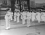 Description :LES MUSICIENS DU "SHERBROOKE CITY BAND" EN PARADE SUR LA RUE WELLINGTON EN 1937 LORS DES FETES DU CENTENAIRE DE SHERBROOKE. AU FOND, UNE PARTIE DU PALAIS DE JUSTICE AU CARRE STRATHCONA.