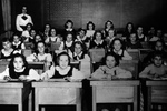 Description :INTERIEUR D'UNE CLASSE DU COURS PRIMAIRE. LES ELEVES SONT ASSIS A LEUR PUPITRE ET LE PROFESSEUR SE TIENT EN ARRIERE.