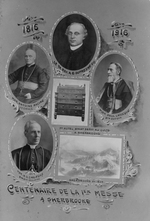 Description :MONTAGE COMPOSE DE QUATRE PERSONNAGES EN MEDAILLON, D'UNE PHOTO ET D'UNE REPRODUCTION DE GRAVURE, AVEC LEUR IDENTIFICATION ET LA MENTION GENERALE "1816-1916 - CENTENAIRE DE LA PREMIERE MESSE A SHERBROOKE". LES PERSONNAGES SONT : MGR ANTOINE RA...