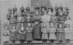 Description :MAITRESSE D'ECOLE AVEC SES 36 ELEVES SUR LE PERRON DE L'EGLISE.
