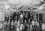 Description :PHOTO DE GROUPE MONTRANT LES MARIES ET LEURS FAMILLES DEVANT UNE RESIDENCE.