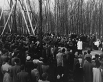 Description :UNE FOULE ASSISTE A LA BENEDICTION QUI SE DEROULE AU PIED DE LA CROIX SUR LE MONT BELLEVUE. NOUS APERCEVONS DE DOS, MGR OLIVIER-ZACHARIE LETENDRE QUI REMPLACE MGR DESRANLEAU ET L'ABBE MAURICE O'BREADY, ASSIS A LA DROITE DE L'EVEQUE