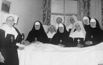 Description :NEUF RELIGIEUSES NON IDENTIFIEES ENTOURENT LE LIT DANS LEQUEL REPOSE L'ABBE ARCHAMBAULT.