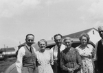 Description :ARTHUR ET SA MERE ENTOURES DE DEUX COUPLES PARENTS, DEVANT UNE AUTOMOBILE. ARTHUR EST LE TROISIEME A PARTIR DE LA GAUCHE.